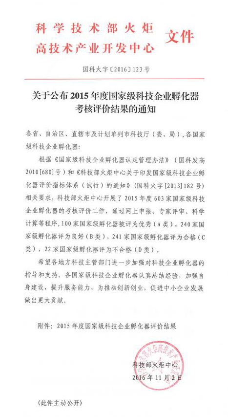 近日,科技部火炬中心公布了2015年度国家级科技企业孵化器考核评价结果,beat365亚洲体育在线官网国家大学科技园孵化器被评为“A类国家级科技企业孵化器”称号。