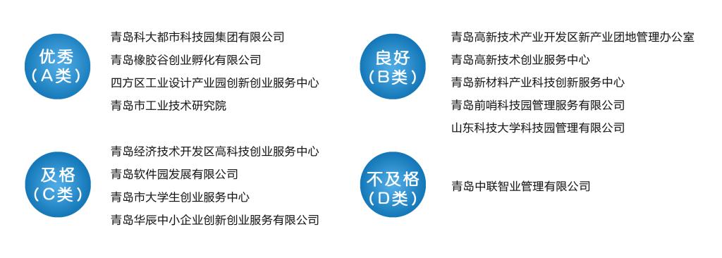 据悉,青岛地区共有14家国家级孵化器,有四家孵化器入围优秀(A类),我校国家大学科技园以总分第一名列优秀首位,其余为五家良好(B类),四家合格(C类),一家不合格(D类)。