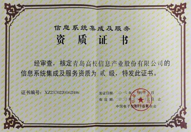 日前,由中国电子信息行业联合会信息系统集成资质工作办公室组织召开的《计算机信息系统集成及服务资质》专家评审会在京结束。经过相关专家的严格评审并广泛听取各方意见后,我校参股企业青岛高校信息产业股份有限公司被授予“信息系统集成及服务二级资质”企业。